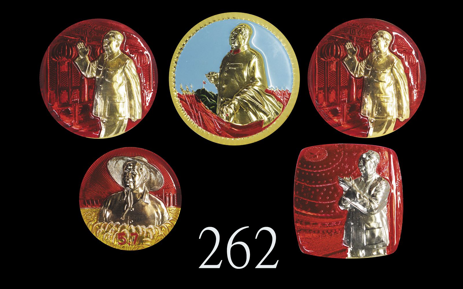 Auction Information 毛澤東紀念章四款不同,共五枚MS66、67佳品Chairman Mao Badges, 5pcs w/4 diff profiles. SOLD AS IS/NO RETURN. NGC MS66 (4) & 67 (5pcs)