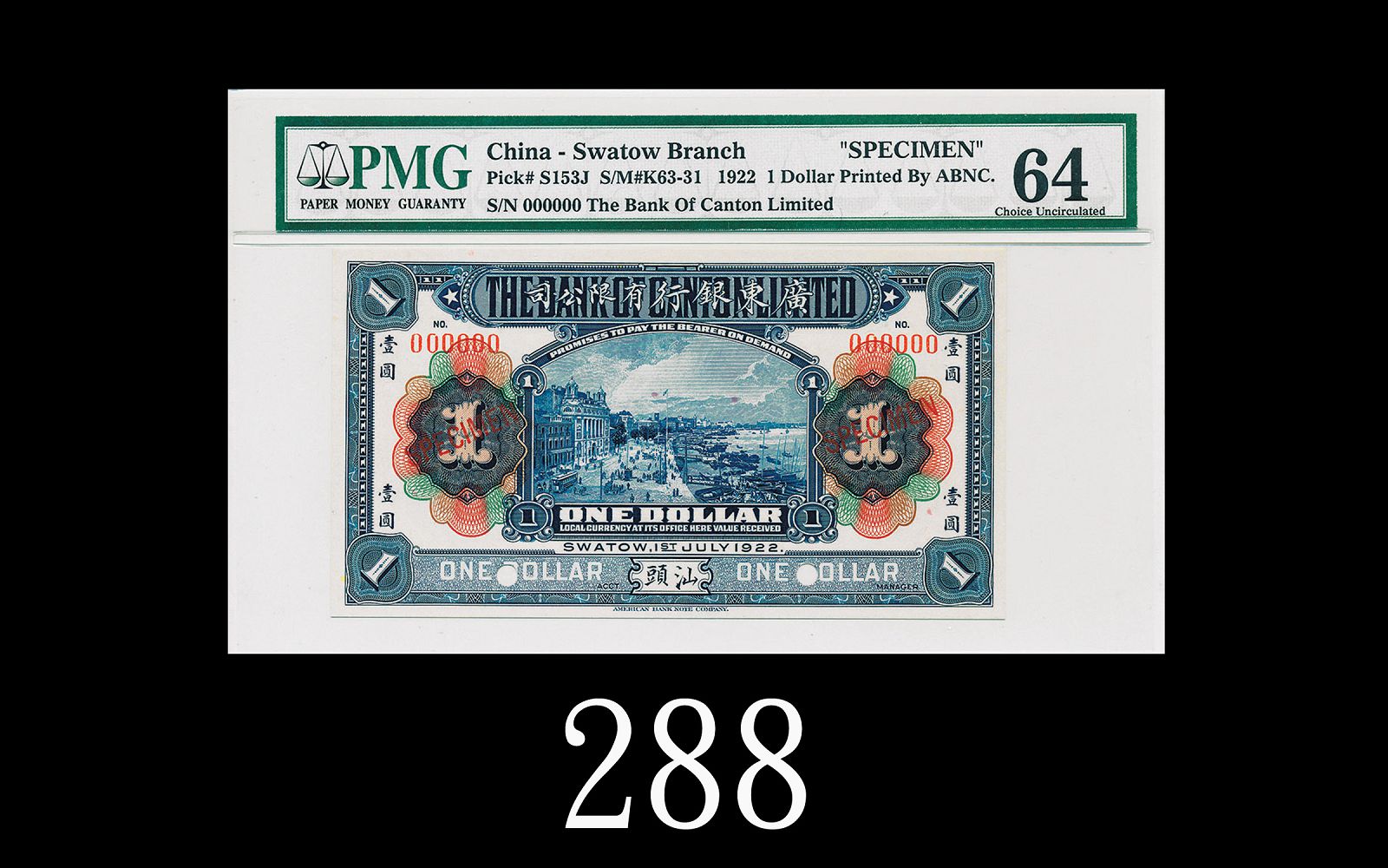Auction Information 1922年廣東銀行有限公司壹圓樣票,汕頭地名甚少見,64分PMG僅見一枚1922 The Bank of Canton Ltd $1 Specimen, s/n 000000, Swatow. Very rare for Swatow. PMG 64