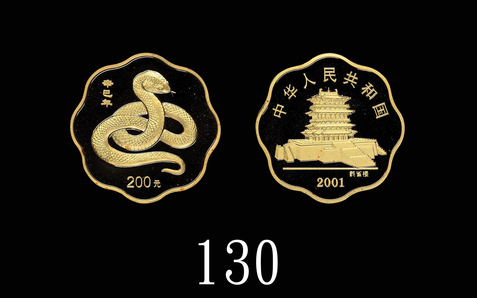 Auction Information 2001年中華人民共和國蛇年梅花精鑄金幣200元,含純金1/2盎司。未使用2001 PRC Yr of Snake Scallop Proof Gold 200 Yuan, AWG 0.5oz. UNC
