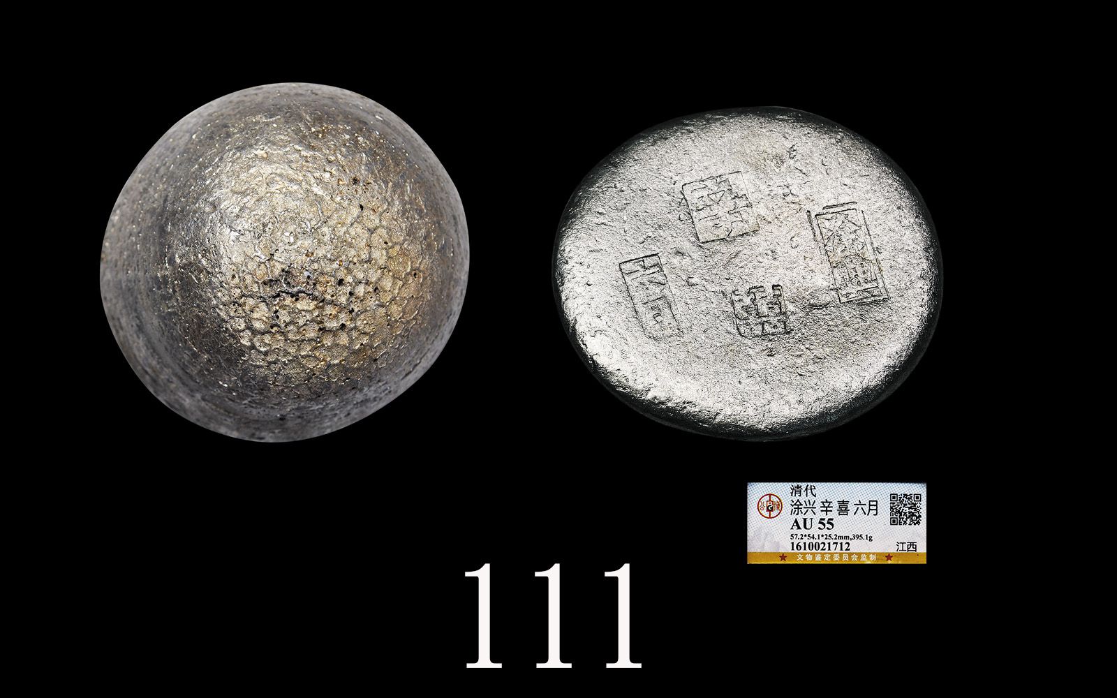 Auction Information 清代「涂興 辛喜 六月」銀錠,重395.1克,體積57.2*54.1*25.2mm,帶公博評級盒,AU55佳品Qing Dynasty Round Silver Sycee, wgt 395.1g, size: 57.2*54.1*25.2mm, w/公博 box. 公博 AU55 #1610021712