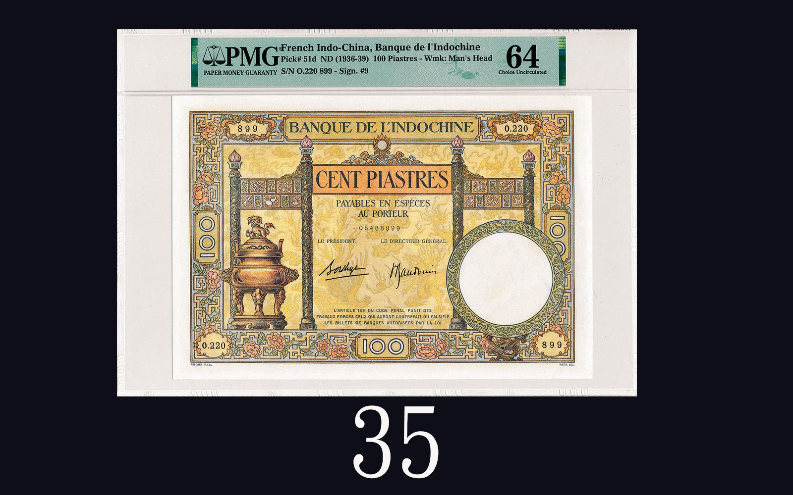 Auction Information 1936-39年法屬東方滙理銀行壹佰元,少見品種,64分佳品1936-39 Banque de L'Indo-Chine 100 Piastres, s/n 0.220 899. Rare. PMG 64