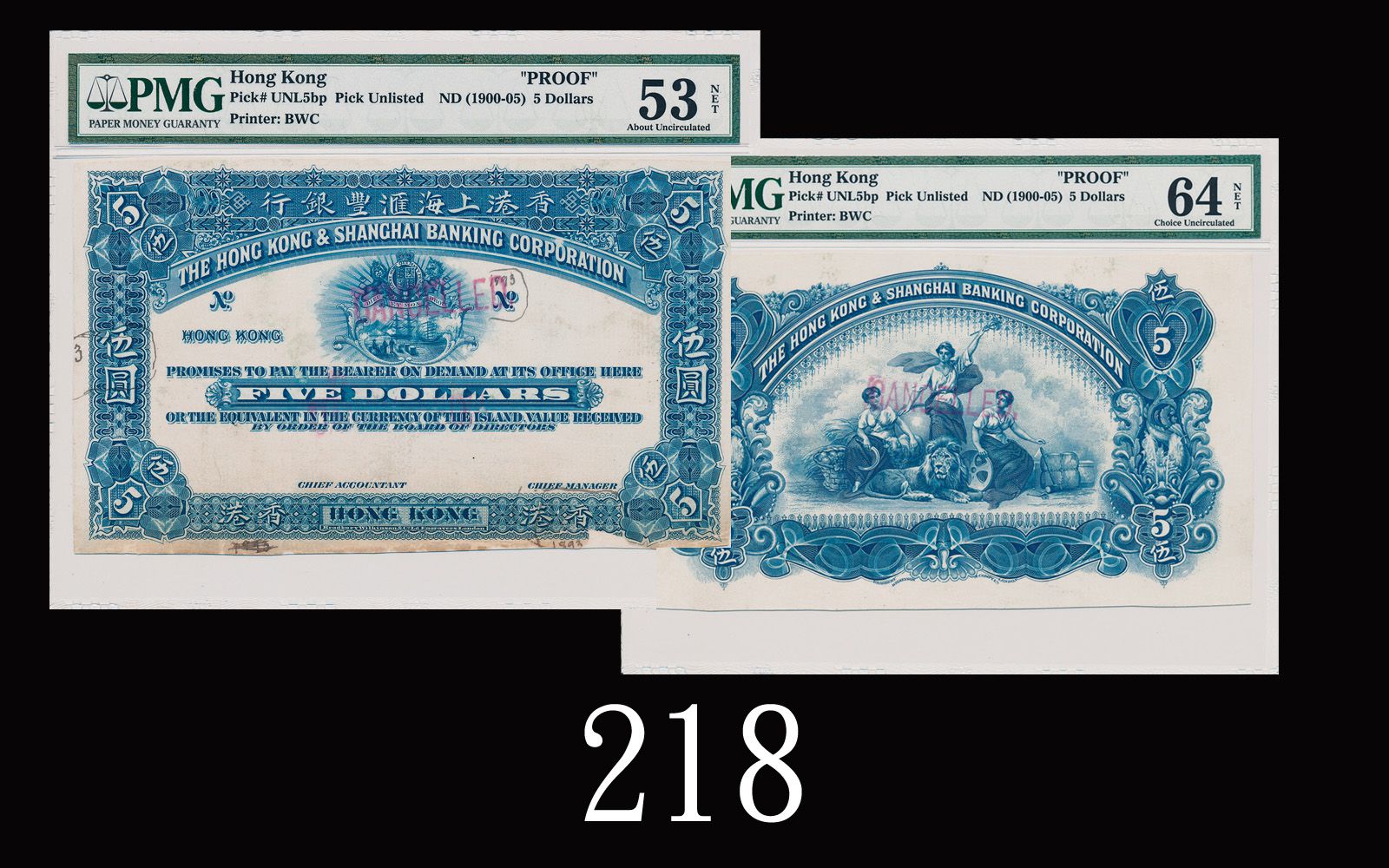 1900-05年香港上海匯豐銀行伍圓單面試色樣張一套兩枚,票面有手寫註腳1893,極稀罕之港鈔品種1900-05 The Hong Kong & Shanghai Banking Corp $5 set of Uniface Proofs (Ma H7), red "CANCELLED" chop on both sides, printer's annotations "1893" on obv. Extremely rare. PMG NET53 AU Details & NET64 Choice UNC, repaired & previously mounted (2pcs)