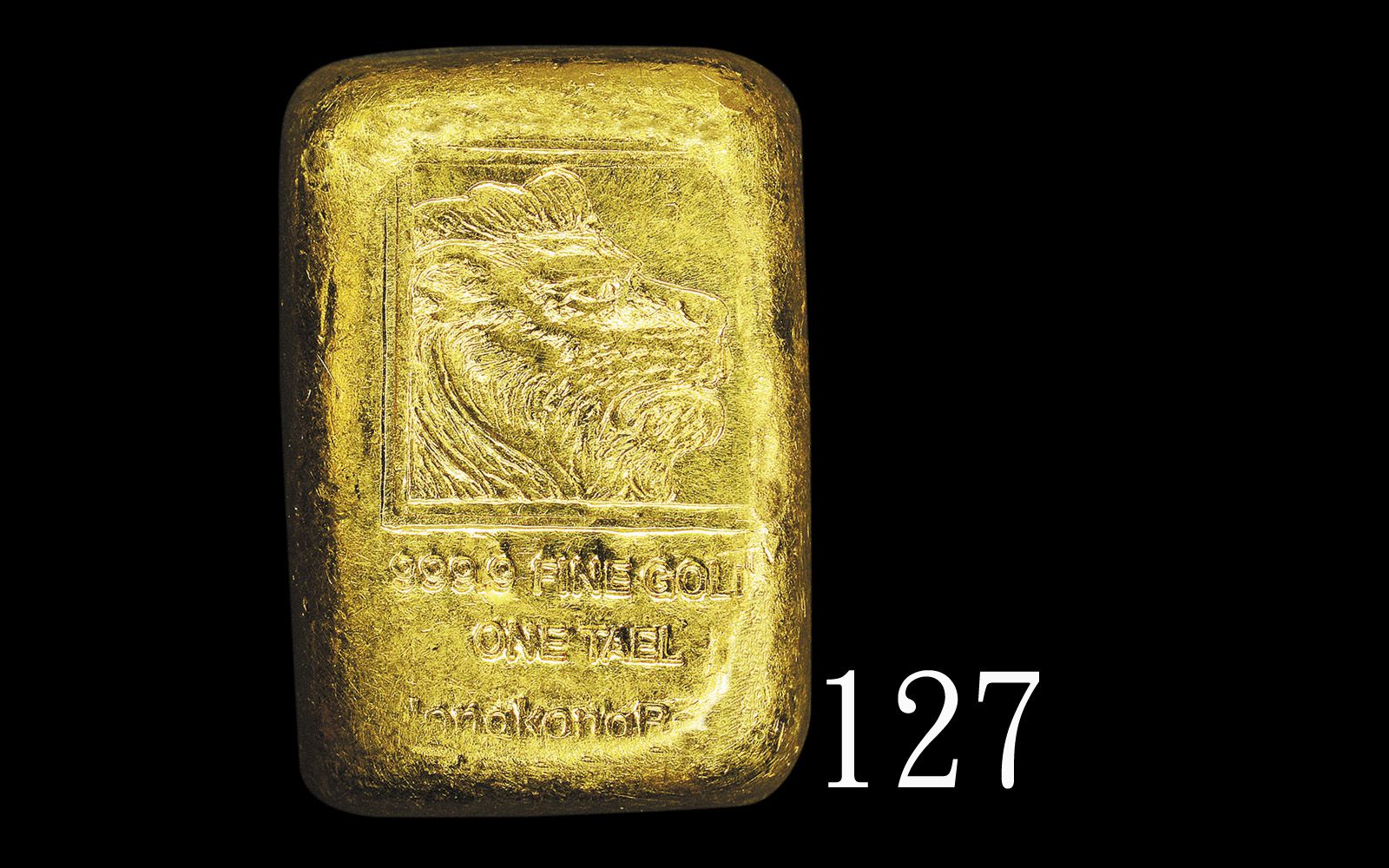 Auction Information 香港匯豐銀行行9999一兩千足金錠,陰文,20世紀七八十年代製,較少見,重38克。極美品近未使用1970-80 Hong Kong & Shanghai Banking Corp One Tael Gold Nugget, indented legend, wgt 38grm. Rare. EF-AU