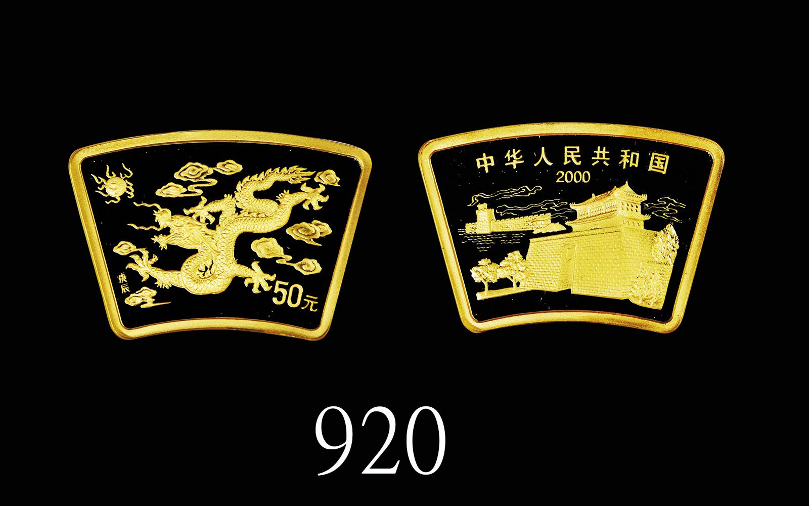 Auction Information 2000年中華人民共和國普製扇形龍年金幣50元,含純金1/2盎司,原盒證書,發行6600枚000 PRC Fan-shaped Dragon Gold 50 Yuan, 1/2oz Ag, orig box & cert, mintage 6600pcs. NGC MS69