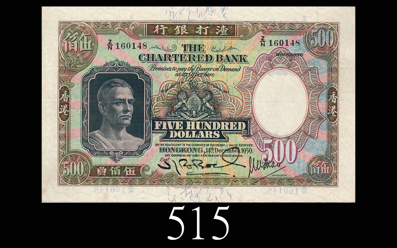 Auction Information 1959年渣打銀行伍佰員,罕品。紙身堅韌難得好品,八成新1959 The Chartered Bank $500 (Ma S42), s/n Z/N160148. Very rare. Well preserved. EF