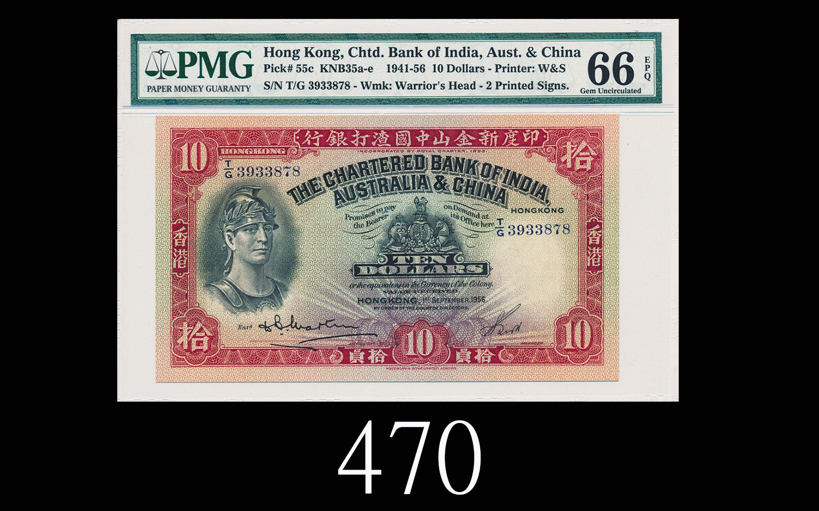 Auction Information 1956年9月印度新金山中國渣打銀行拾員,少見EPQ66佳品1956/09 The Chartered Bank of India, Australia & China $10 (Ma S12), s/n T/G3933878. Very rare. PMG EPQ66