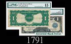 1899年美國銀銀券1元錯體票:背倒印,極罕見之美國旱期錯體鈔1899 USA One Silver Dollar, s/n M39814030M pp B, inverted back error. Extremely rare. PMG 15 |