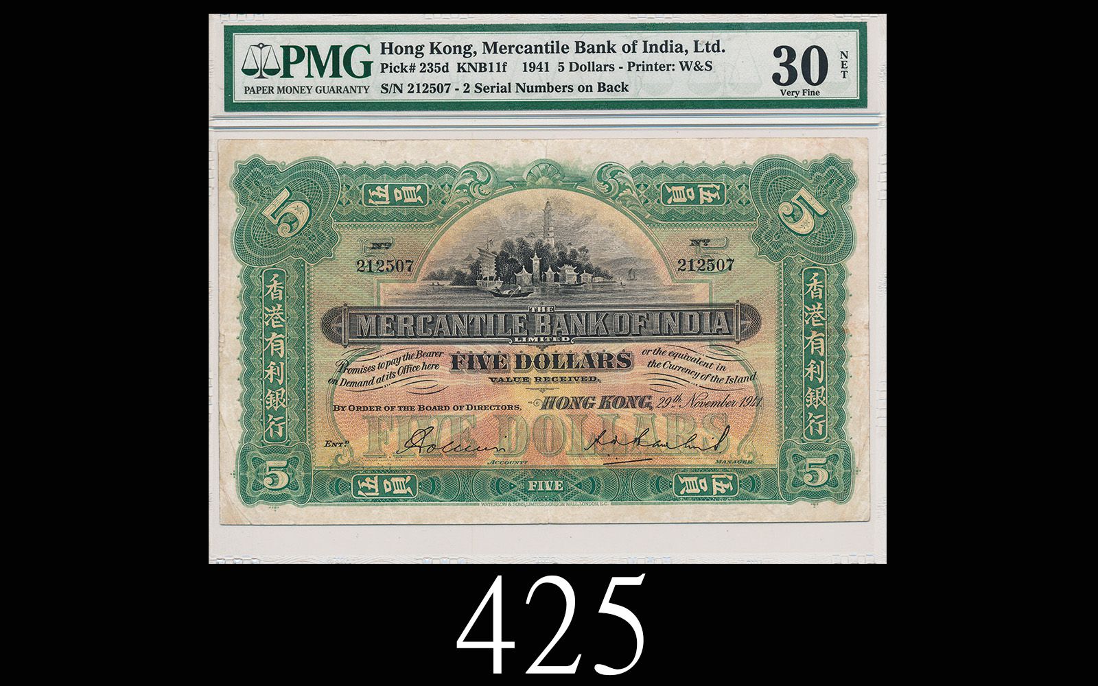 1941年香港有利銀行伍員,無污無字保存極完好。微修1941 The Mercantile Bank of India Limited $5 (Ma M3), s/n 212507. Very rare & well preserved. PMG NET30 minor repairs & minor rust
