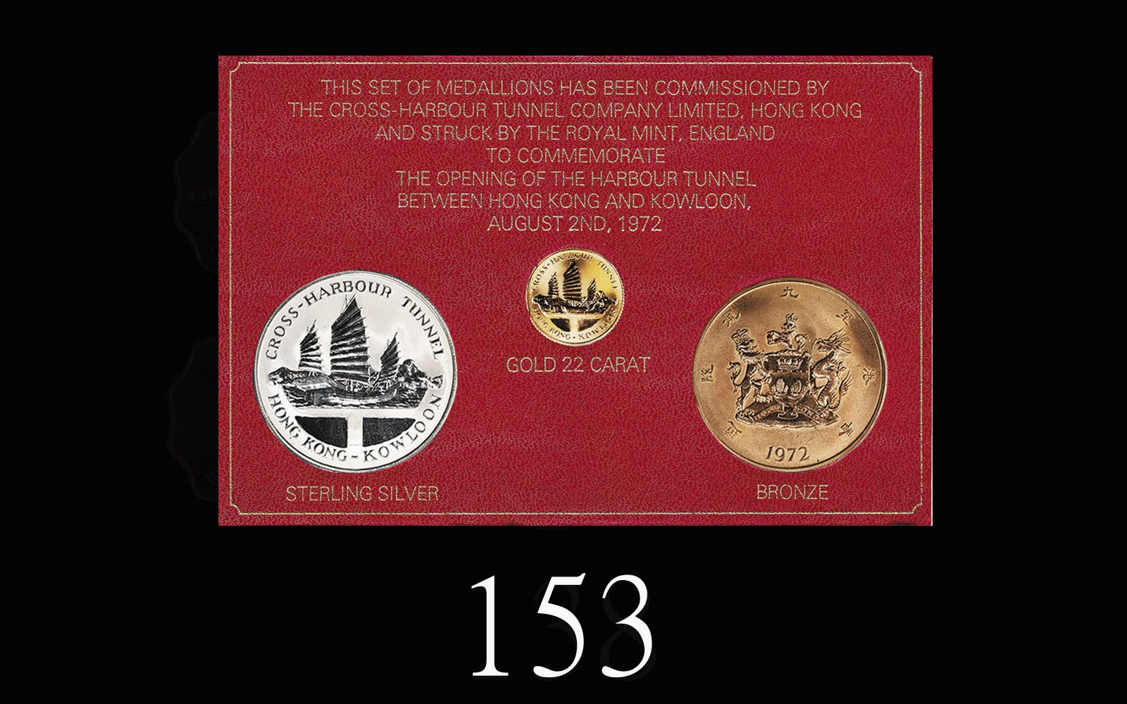1972年香港海底隧道開通紀念金章、銀章、銅章一組三枚MS66RD、69精品,原套。金章重7.8克22K金1972 HK Gold, Silver & Bronze Medallions Commemorating the Opening of Harbour Tunnel, 22kt & 7.8grm for gold, w/orig holder.. SOLD AS IS/NO RETURN. PCGS MS69 for gold & silver, bronze 66RD 金盾 (3pcs)