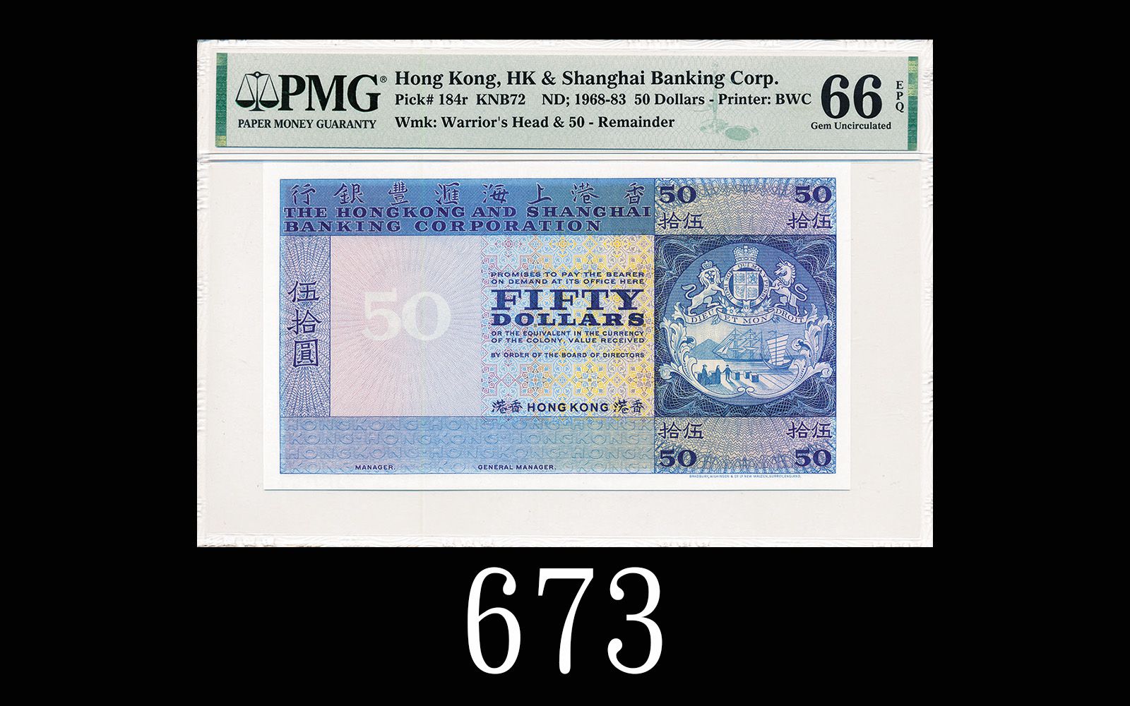 1968-83年香港上海滙豐銀行伍拾圓庫存票,甚少見之品種,66EPQ冠軍分其中一枚1968-83 The Hong Kong & Shanghai Banking Corp $50 Remainder (Ma H25). Very rare. One of the highest score items. PMG 66EPQ