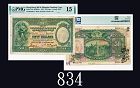 1927年香港上海滙豐銀行伍拾圓,頭版「飛輪」,坊間拍場均極其罕見,原紙評級品。背有字戳記1927 The Hong Kong & Shanghai Banking Corp $50, s/n B222344, 1st issue. Very rare date. PMG 15 |