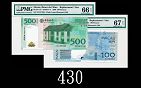 2013年大西洋銀行壹佰圓、2008年澳門中國銀行伍百圓,補版票兩枚66、67EPQ佳品2013 & 2008 Banco Nacional Ultramarino & Banco Da China 100 & 500 Patacas, s/ns ZZ639808 & ZC127400. PMG 66 & 67EPQ (2pcs) |